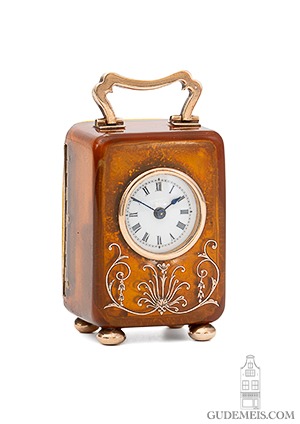 De vierkante glazen wijzerplaat heeft facet geslepen randen en Arabische cijfers. De vergulde messing wijzers hebben ruitvormige delen.