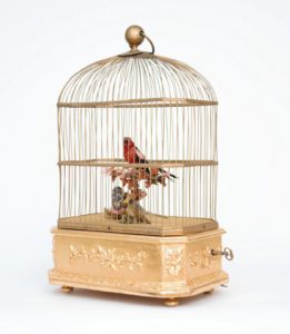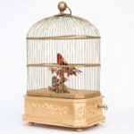 Een Franse verguld houten vogelkooi met vogelmechaniek van zingende vogels, Bontems circa 1880