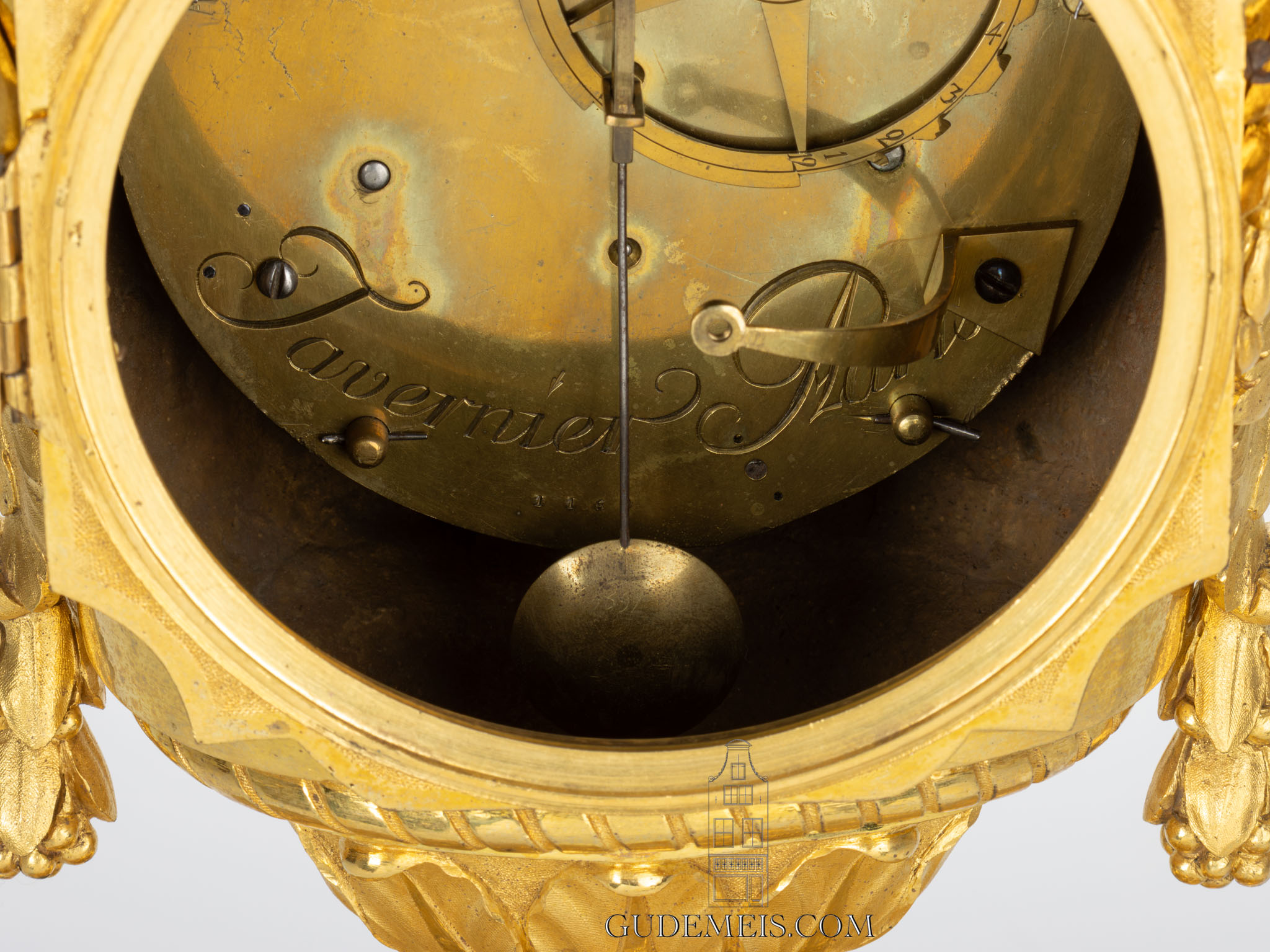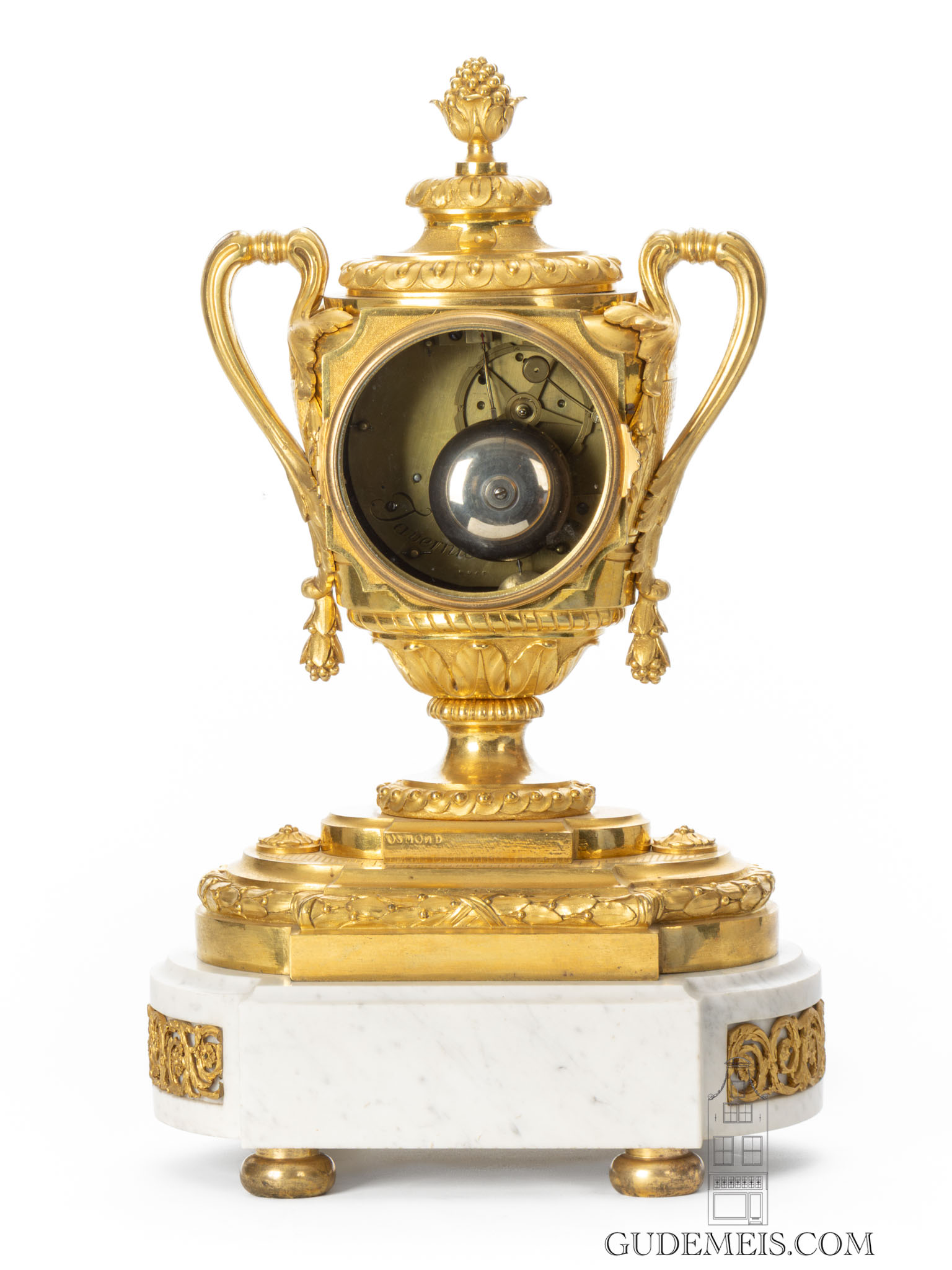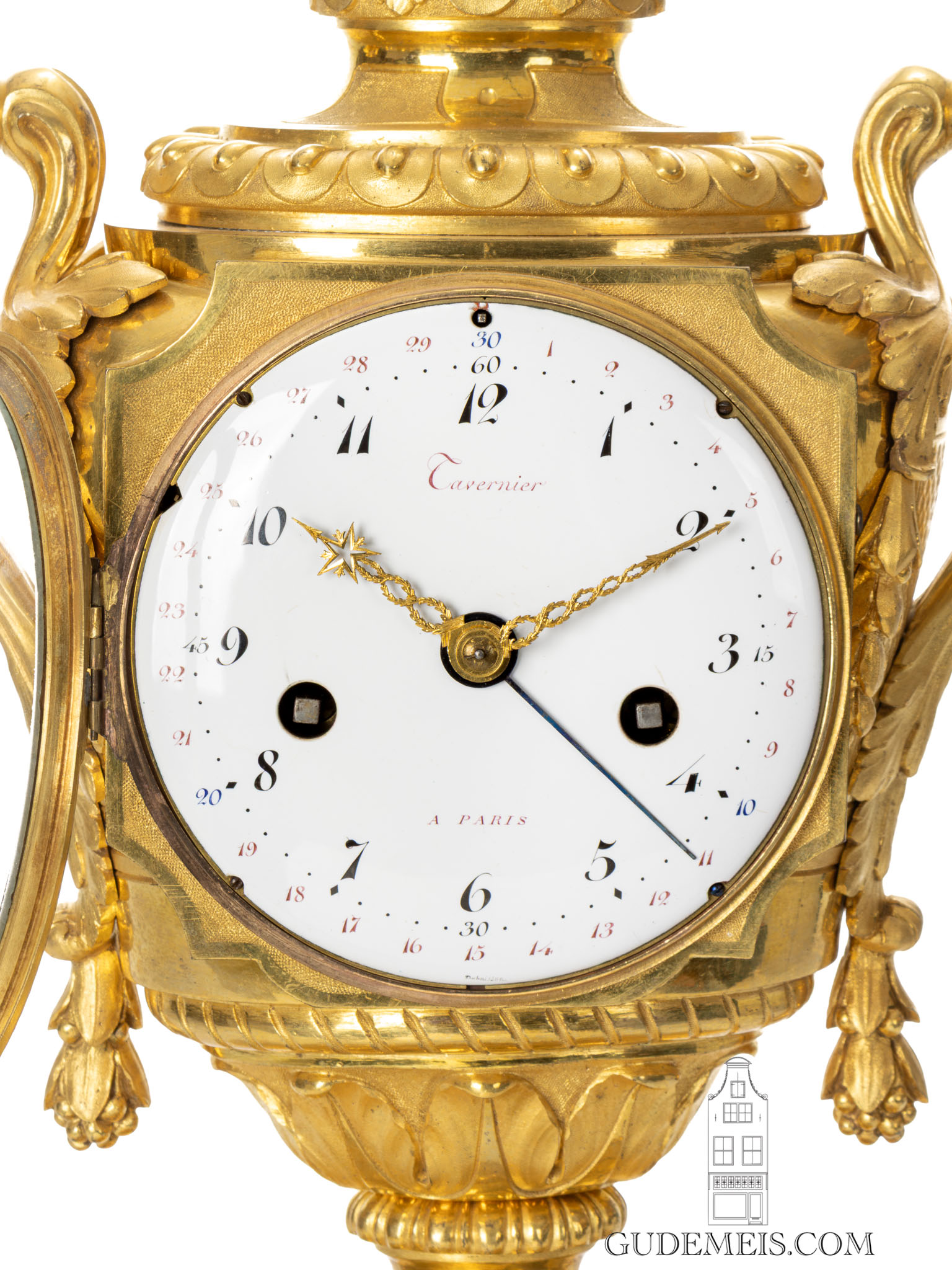 Tijdens de regeerperiode van Lodewijk XVI of Louis XVI (1774 – 1789) was er hernieuwde bewondering voor de kunst van de Klassieke Oudheid onder andere door de ontdekking van Pompeii. Omdat er veel minder bekend was dan nu was het Classicisme geen slaafse navolging van de Oudheid. Het was eerder een combinatie en het toepassen van decoratieve elementen die uit die periode stammen en creëerden daarmee iets nieuws. Ten eerste is de vaasvorm heel passend als we denken aan de vele Griekse vazen die er bekend zijn uit de Griekse oudheid. Maar daarnaast zijn bijvoorbeeld de Acanthus en laurierbladeren samen met het ajour reliëf in de voet heel kenmerkend voor de Louis XVI periode. Zowel het ontwerp en de kwaliteit van deze klok zijn van zeer hoge kwaliteit wat niet verwonderlijk is omdat deze is vervaardigd door Robert Osmond. Hij wordt gezien als één van de beste bronziers uit deze periode en is ook één van de weinigen die zijn werk signeerde. Hij was echter niet verantwoordelijk voor het uurwerk. Dat werd geleverd door Tavernier die zowel de achterplatine als de fraaie wijzerplaat signeerde. Op deze manier is deze klok niet alleen een fraai voorbeeld van de Lodewijk XVI periode. Het is ook nog een illustratie van de samenwerking van handwerkslieden die leidde tot prachtige objecten.