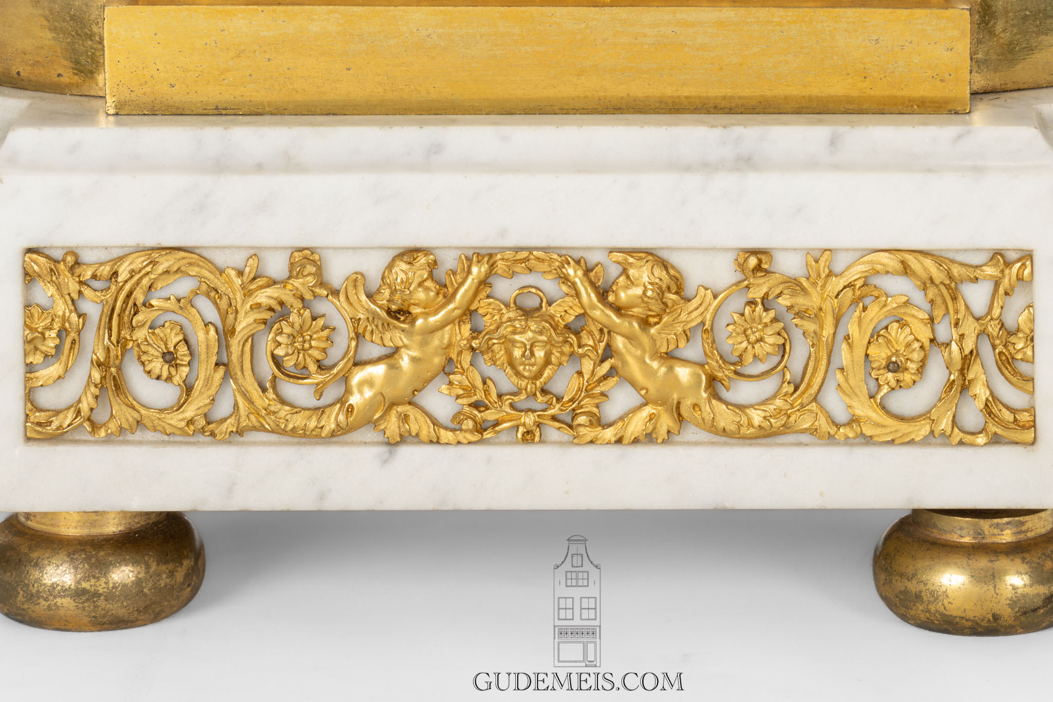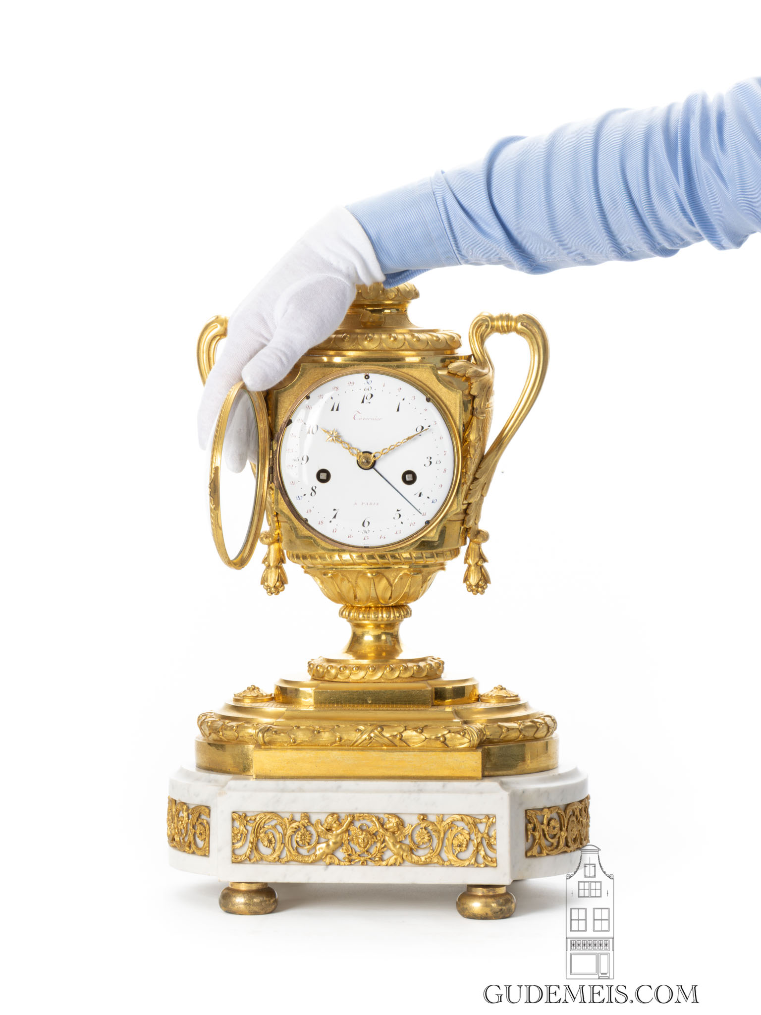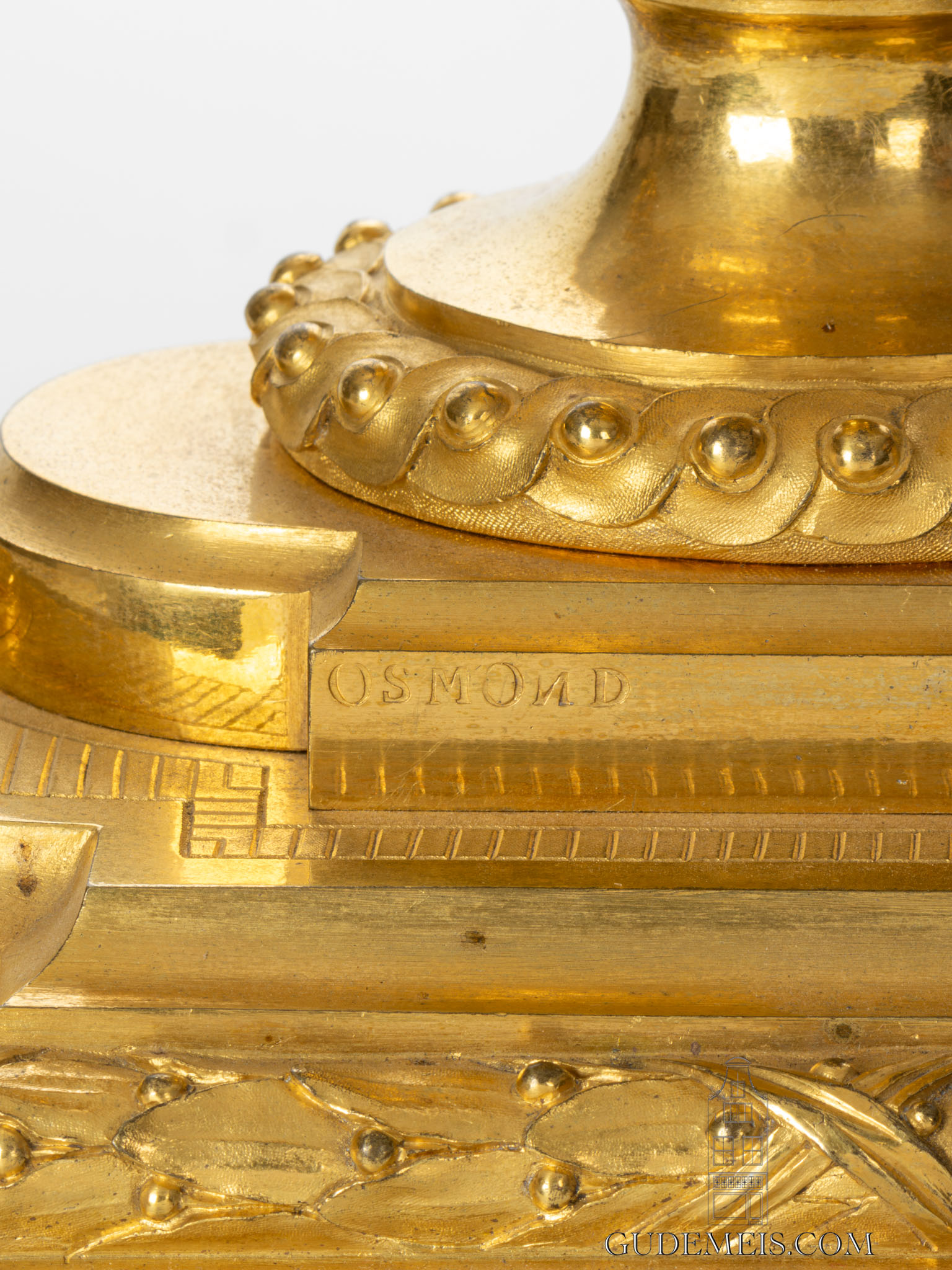 Tijdens de regeerperiode van Lodewijk XVI of Louis XVI (1774 – 1789) was er hernieuwde bewondering voor de kunst van de Klassieke Oudheid onder andere door de ontdekking van Pompeii. Omdat er veel minder bekend was dan nu was het Classicisme geen slaafse navolging van de Oudheid. Het was eerder een combinatie en het toepassen van decoratieve elementen die uit die periode stammen en creëerden daarmee iets nieuws. Ten eerste is de vaasvorm heel passend als we denken aan de vele Griekse vazen die er bekend zijn uit de Griekse oudheid. Maar daarnaast zijn bijvoorbeeld de Acanthus en laurierbladeren samen met het ajour reliëf in de voet heel kenmerkend voor de Louis XVI periode. Zowel het ontwerp en de kwaliteit van deze klok zijn van zeer hoge kwaliteit wat niet verwonderlijk is omdat deze is vervaardigd door Robert Osmond. Hij wordt gezien als één van de beste bronziers uit deze periode en is ook één van de weinigen die zijn werk signeerde. Hij was echter niet verantwoordelijk voor het uurwerk. Dat werd geleverd door Tavernier die zowel de achterplatine als de fraaie wijzerplaat signeerde. Op deze manier is deze klok niet alleen een fraai voorbeeld van de Lodewijk XVI periode. Het is ook nog een illustratie van de samenwerking van handwerkslieden die leidde tot prachtige objecten.