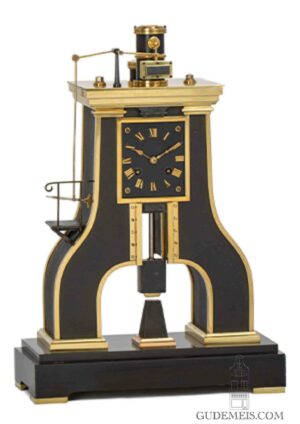 6.5-cm geëmailleerde wijzerplaat met Romeinse cijfers en rode Arabische datumcijfers gesigneerd Imbert L’aîné, fraaie gegraveerde en floraal ajour verguld messing wijzers en geblauwde datumwijzer, veer-aangedreven uurwerk met ankergang en slinger met zijde-ophanging en een gangduur van 8 dagen, fraaie gegoten en geciseleerde vuurvergulde bronzen kast met hangende guirlandes en bekroond door een ornamentale vaas, geplaatst op een zuil geflankeerd door voluten met acanthus bladeren, ovale voet met witmarmeren plint op vergulde slofpoten.