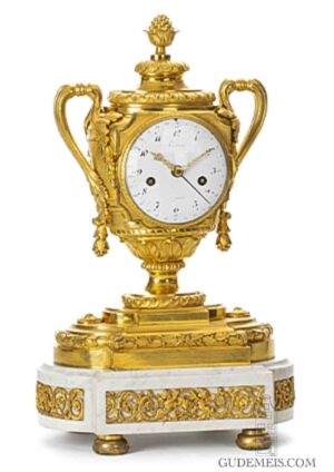 8-daags uurwerk met datumaanduiding, vuurverguld bronzen kast op marmeren voet.