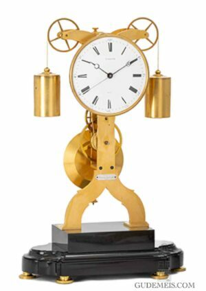 The portico mantel clock was modelled after the triumph arches of the Romans. It was introduced in the Empire period and in this period often used by precision makers. This clock is very decorative and one only has to look at the finely cast and chiselled capitals to appreciate the skill and craftsmanship that went into the case. But besides being a beautiful decorative object it also is a precision clock. The temperature compensated gridiron pendulum in combination with the pinwheel escapement make it possible for this clock to run very exactly. So this impressive clock is not only a beautiful piece for the interior but also a fine time keeper!