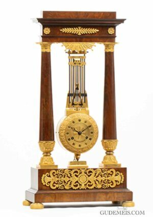 The movement is driven by two spring barrels and has a duration of two weeks. It Is regulated by pinwheel escapement mounted on the back plate in combination with a silk suspended pendulum. The clock has half hour striking on a bell by means of countwheel.