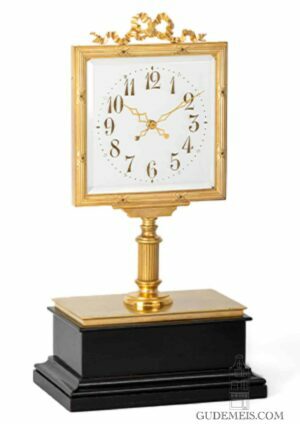 The movement is fitted in a gilt cylinder case surmounted by a beautiful gilt bronze eagle with spread wings. The cylinder is placed on a basement with a relief depicting two putti. The whole is flanked by a reading woman and a writing man personifying ‘Study’ and ‘Philosophy’. The wide black marble base has rounded ends and a Acanthus leaf moulding. The front has two annular deep reliefs depicting masks flanking another relief. This depicts two putti between scrolls flanking another mask. The whole is raised on flat annular feet. The design by François Rémond in which he encorporated the two figures by Simon-Louis Boizot still excists.