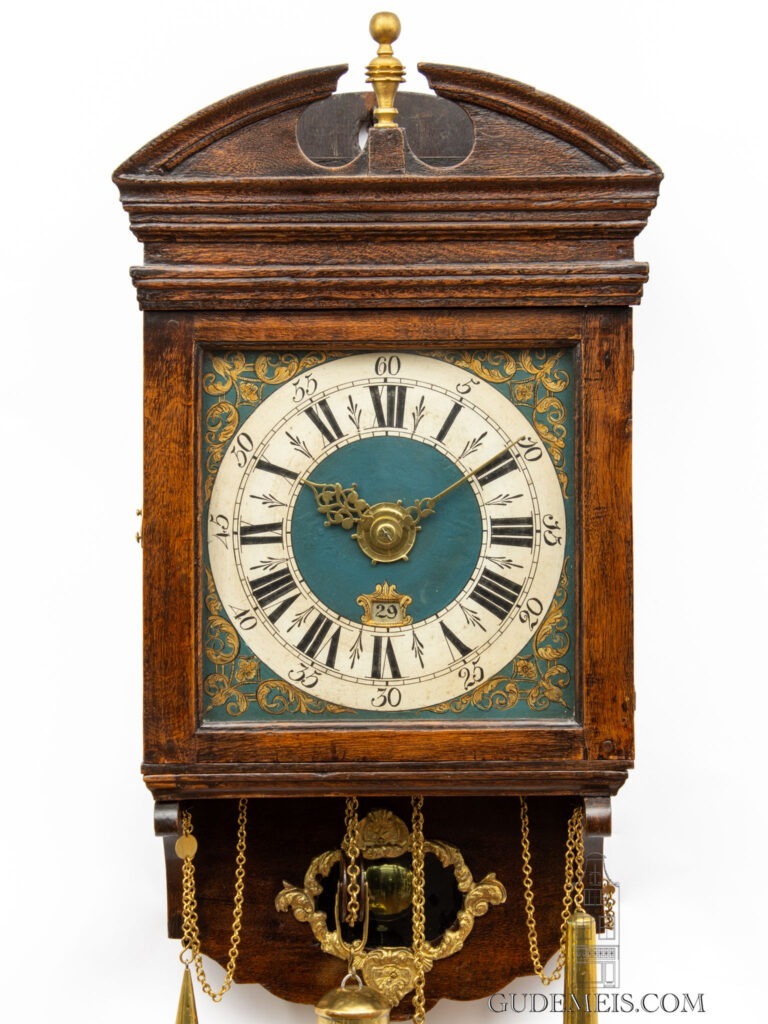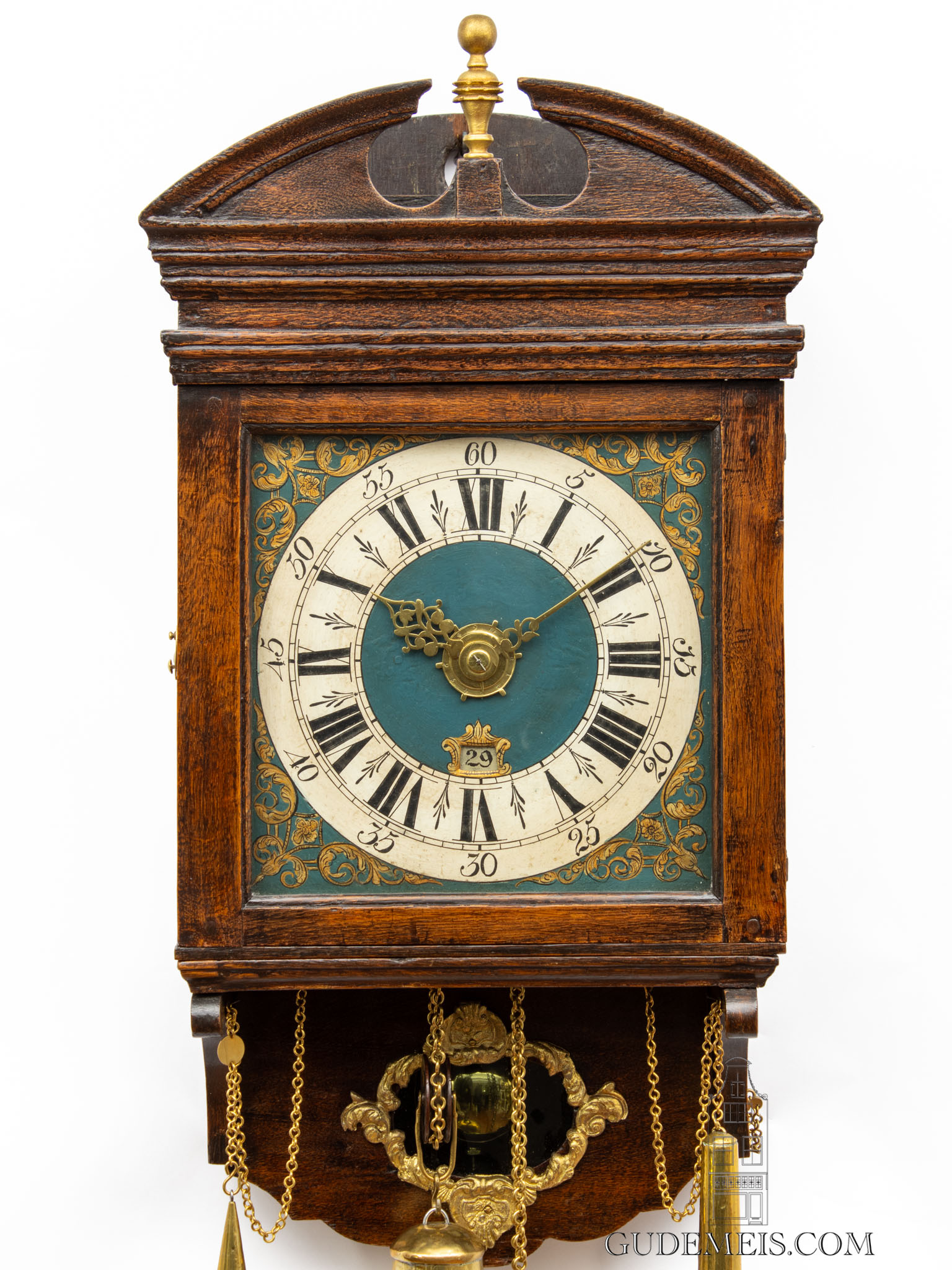 Een zeldzaam Fries provinciaal eikenhouten wandklokje met slagwerk en wekker, derde kwart 18e eeuw.