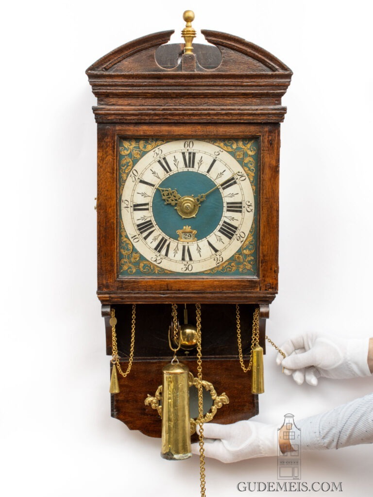 Een zeldzaam Fries provinciaal eikenhouten wandklokje met slagwerk en wekker, derde kwart 18e eeuw.