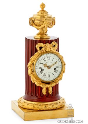 The case is surmounted by two finely cast and chiseled figures. A nude male with wings representing Amor standing next to a female nude. She represents Psyche and holds a gilt bronze wreath above Amor’s head. They flank an ormolu case with a lyre shaped mount with swans to the sides. The whole placed on a red marble (griotte rouge) base lined with an ormolu acanthus moulding. This base is raised on beautifully made winged claw feet. The design of the group was made by the sculptor Claude Michallon 1752 – 1799. He first studied in Paris and later went six years to Rome. After his return in 1791 he received commissions for large public sculptures. His work was well received and he won several prizes. He also designed several clock cases of which this one is the most celebrated.